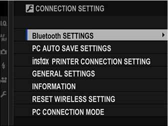 [ON]: The camera automatically establishes a Bluetooth connection with paired devices when turned on. [OFF]: The camera does not connect via Bluetooth. |
