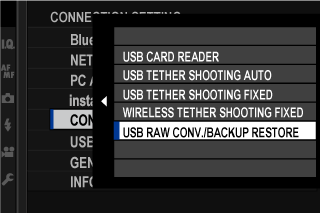 Before proceeding, select [USB RAW CONV./BACKUP RESTORE] for D[CONNECTION SETTING] > [CONNECTION MODE] in the camera menus.