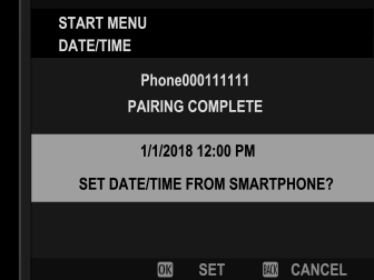 When pairing is complete, you will be prompted to set the camera clock to the time reported by the smartphone or tablet. Check that the time is correct.