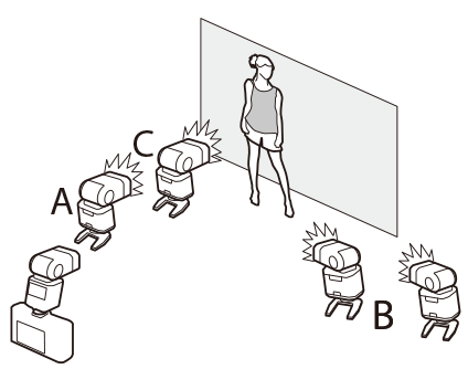 また、システムを構成するフラッシュをA、B、Cの3つのグループに分けて、グループごとに発光モード、発光量を設定できます。