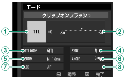 クリップオンフラッシュ 別売のクリップオンフラッシュを接続して、電源を入れている場合に表示されます。