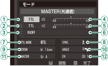 グループごとに設定されるモードに応じて、調光補正や発光強度が設定できます。 モードがTTLに設定されているときは調光補正を設定できます。 モードがM/Multiに設定されているときは発光強度を設定できます。 モードがTTL%に設定されているときは光量比と調光補正が設定できます。 補正量、発光強度の設定がフラッシュの調整能力を超える場合には、十分に調整できない場合がありますので、実際の撮影画像で確認してください。 |