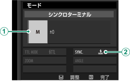 ホットシューに何も接続されていない場合やカメラに対応したクリップオンフラッシュ以外が接続されている場合は、シンクロターミナルの設定画面が表示されます。