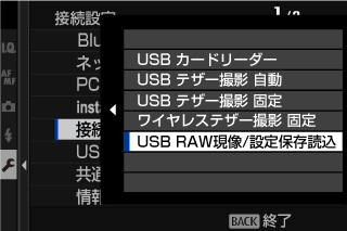 カメラをあらかじめ D接続設定 > PC接続モード > USB RAW現像/設定保存読込 に設定してください。