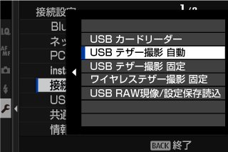USBテザー撮影 固定 は、カメラをテザー撮影専用の状態で使用する場合に選択してください。この状態ではUSBケーブルを抜いてもカメラは通常のカメラとして機能せず、撮影した画像がメモリーカードに保存されませんのでご注意ください。