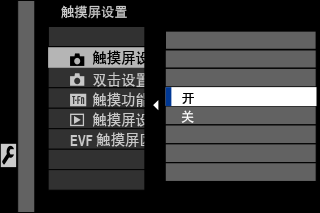 若要禁用触控控制并隐藏触摸屏模式指示,请将 D按钮/拨盘设置 > 触摸屏设置 > x触摸屏设置 选为 关。