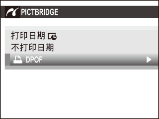 若要在照片上打印拍摄日期,请在 PictBridge 显示中按下 DISP/BACK,然后选择 打印日期(若无需在照片上打印拍摄日期,请选择 不打印日期)。为确保日期正确,请在拍摄前设定照相机时钟。某些打印机不支持日期打印。